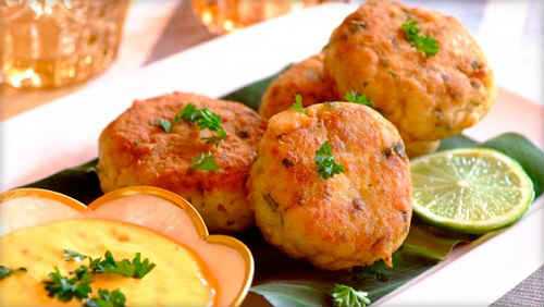 Удивить гостей можно, запрятав в каждую котлетку по креветке. Рыбную основу для такого угощения готовим традиционно, только перца нужно класть меньше обычного.