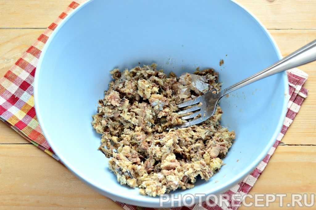 - Откройте банку с консервами специальным инструментом или ножом. Во втором случае не спешите и действуйте очень аккуратно.Извлеките рыбу в отдельную емкость. Удалите крупные кости из кусочков. Они относительно мягкие, но недостаточно для того, чтобы можно было полноценно размять. Рыбное филе растолките вилкой в кашицеобразную массу.