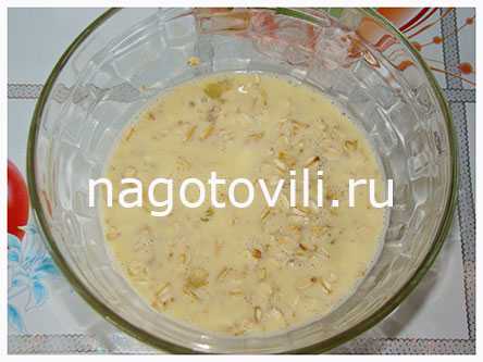 Овсяные хлопья промойте и высыпьте в яично-молочную смесь. Оставьте набухать на 30 минут.