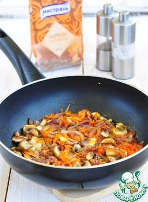 Очистить вторую луковицу, морковь и грибы. Лук нарезать полукольцами, грибы полосками, морковь натереть на терке. Обжарить на растительном масле до готовности.