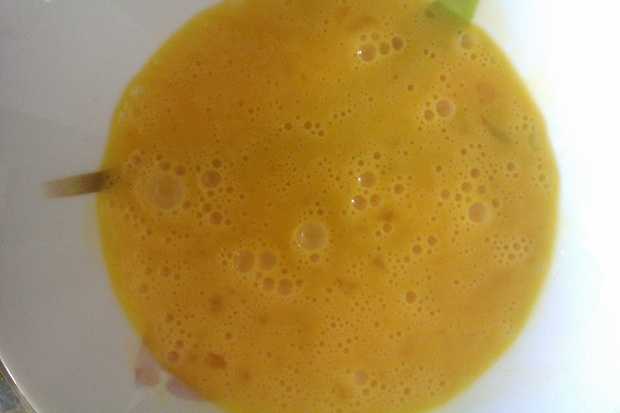 Разбейте в мисочку сырое яйцо, взбейте вилочкой и влейте молоко. Размешайте.