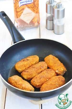 Постоянно смачивая руки водой, сформировать длинные котлетки размером чуть больше указательного пальца. Запанировать в муке, обжарить в малом количестве растительного масла до румяной корочки. Для более красивого цвета и вкуса котлет в муку можно добавить немного красной молотой копченой паприки. Полуготовые котлеты переложить в форму для запекания. Сковороду помыть.