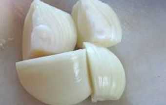 Воспользовавшись кухонным ножом, очищаем лук от шелухи. Промываем овощ под проточной водой и перекладываем на разделочную доску, с помощью кухонного ножа разрезаем лук на 4 части. После луковые кусочки выкладываем в свободную миску.