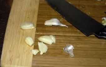 Чесночные зубчики перекладываем на разделочную доску и, надавив на них рукояткой ножа, снимаем шелуху.