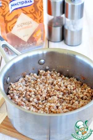 - Запарить в горячей воде помытую гречку на 10 минут, добавив соль и специй.