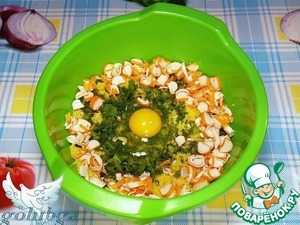 Смешайте крабовые палочки с нарезанной зеленью и протертым картофелем, добавьте яйцо, соль, черный молотый перец.