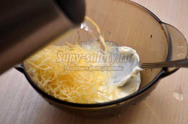 Готовим будущую подливу. В мисочку кладем сметану, туда же натираем сыр и все заливаем 2/3 стакана кипятка. Солим.