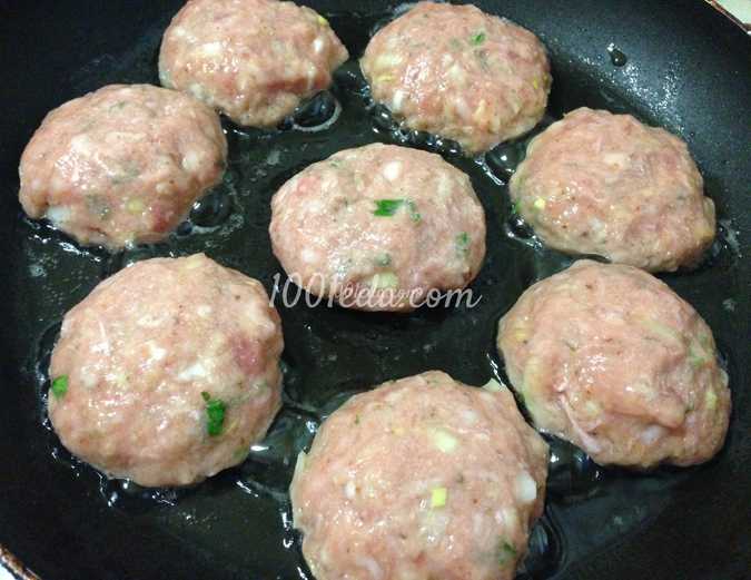 Готовый фарш хорошо отбить. 6. Сформировать из фарша аккуратные котлетки и запанировать их в пшеничной муке. Само собой, что для панировки можно использовать как муку, так и сухари. 7. Выложить заготовки в сковороду с заранее разогретым подсолнечным маслом и обжарить с двух сторон до появления золотисто-коричневой корочки.