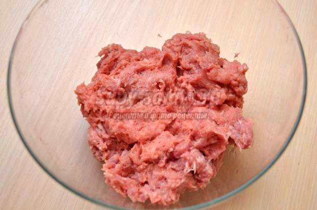Сначала необходимо выложить в миску фарш. Если в наличии его не оказалось, то можно приготовить его самостоятельно из куриного филе.