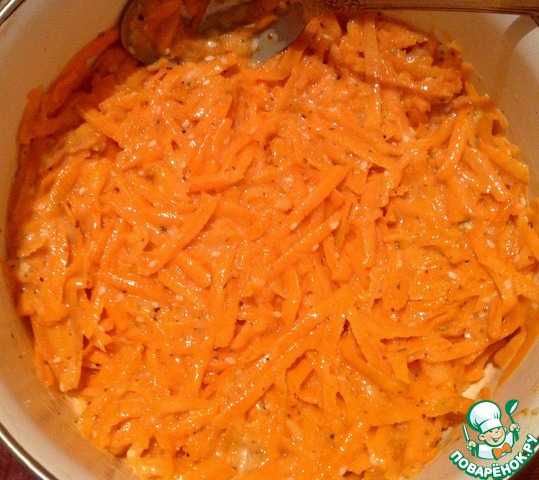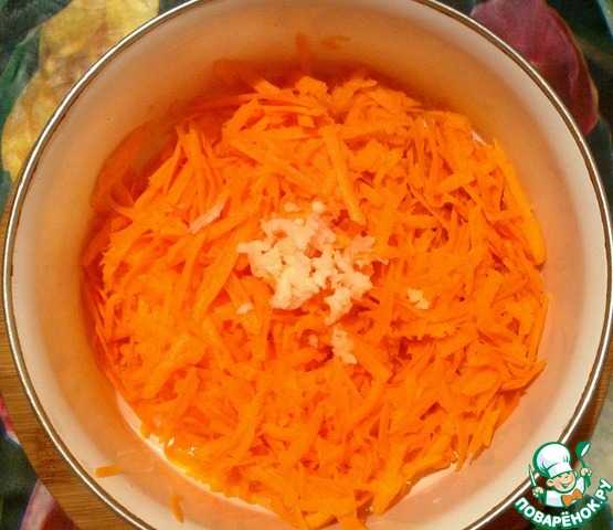 Морковь помыть, очистить, натереть на крупной терке. Если много сока, то отжать. Добавить пропущенный через пресс чеснок.