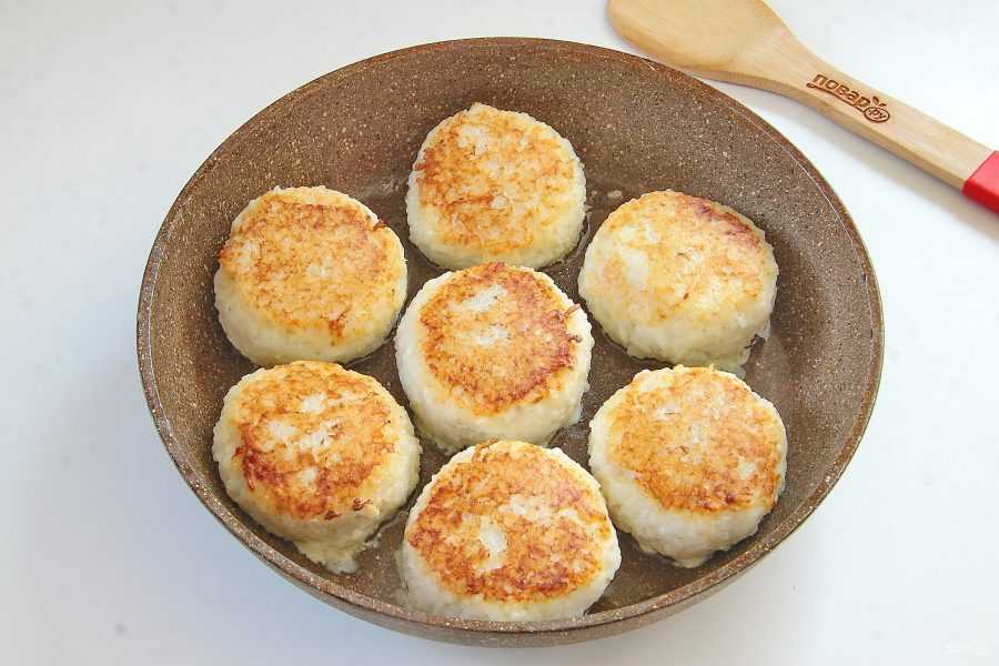 Обжариваем на заранее разогретой с растительным маслом сковороде. С одной стороны обжариваем, накрыв сковороду крышкой, с второй — без крышки до золотистой корочки. Снимаем и даем стечь лишнему маслу.