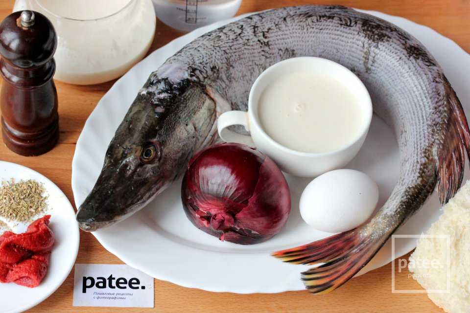 Для приготовления рыбных биточков в томатном соусе нам понадобятся следующие ингредиенты: щука весом примерно 1 кг 450 грамм, лук, куриное яйцо, сливки 30 % жирности, молоко, пшеничный хлеб, вода, орегано, томатная паста, соль, чёрный молотый перец.