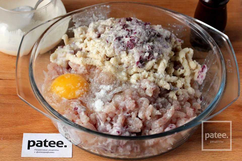 - Очищенную от кожуры картошку нужно мелко натереть и вмешать в фарш;
