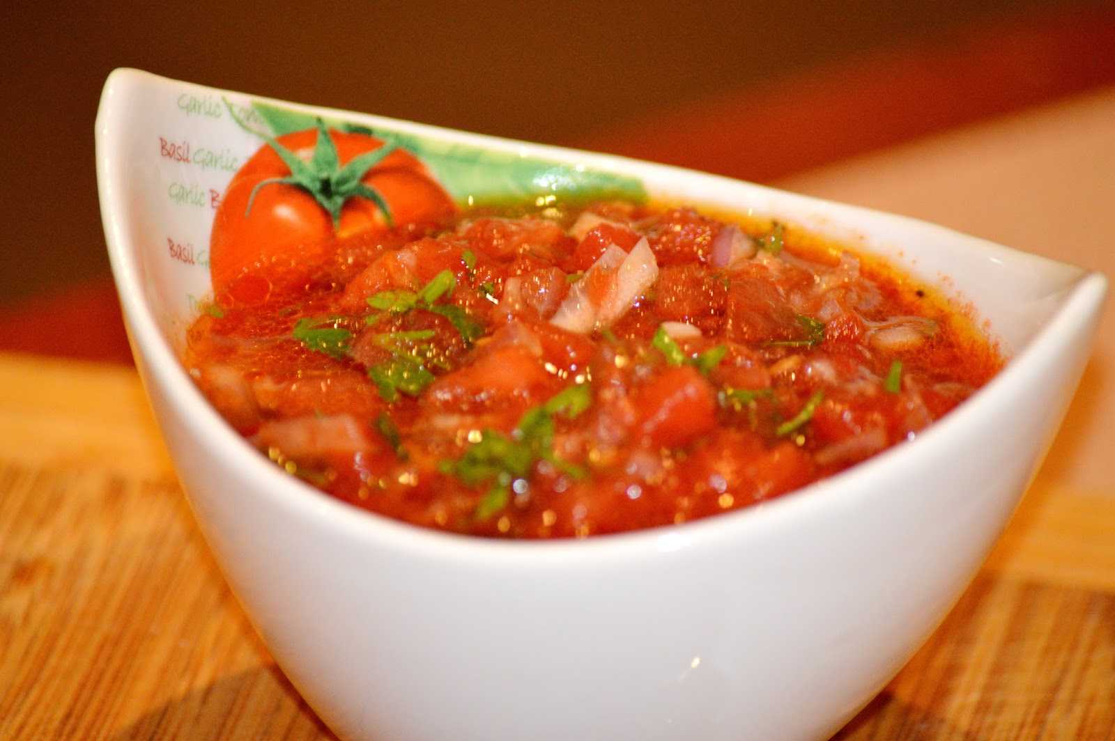 - Томаты и лук нарезать. Для маринада подходят крупные куски томата, из которых нужно выдавить сок, и кольца лука. Если готовится соус, то рекомендуется нарезать продукты средним кубиком и заложить в чашу блендера.