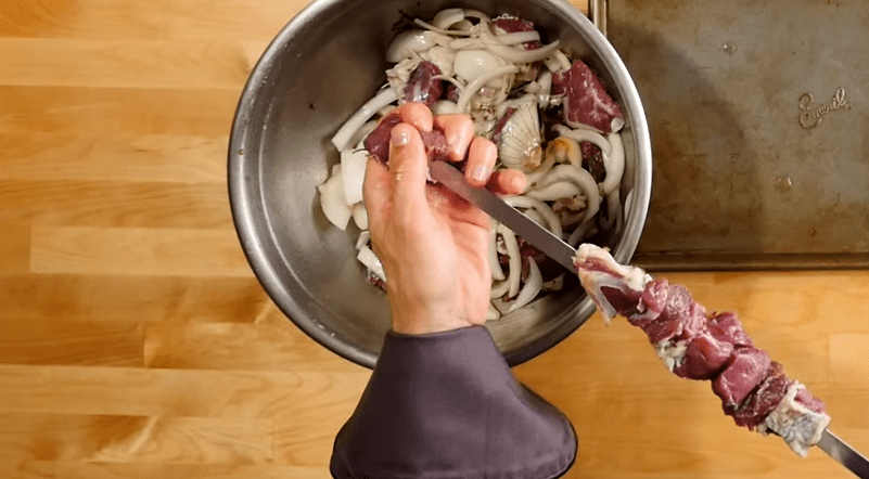 3. Маринованные куски баранины нанизываем на шампуры.