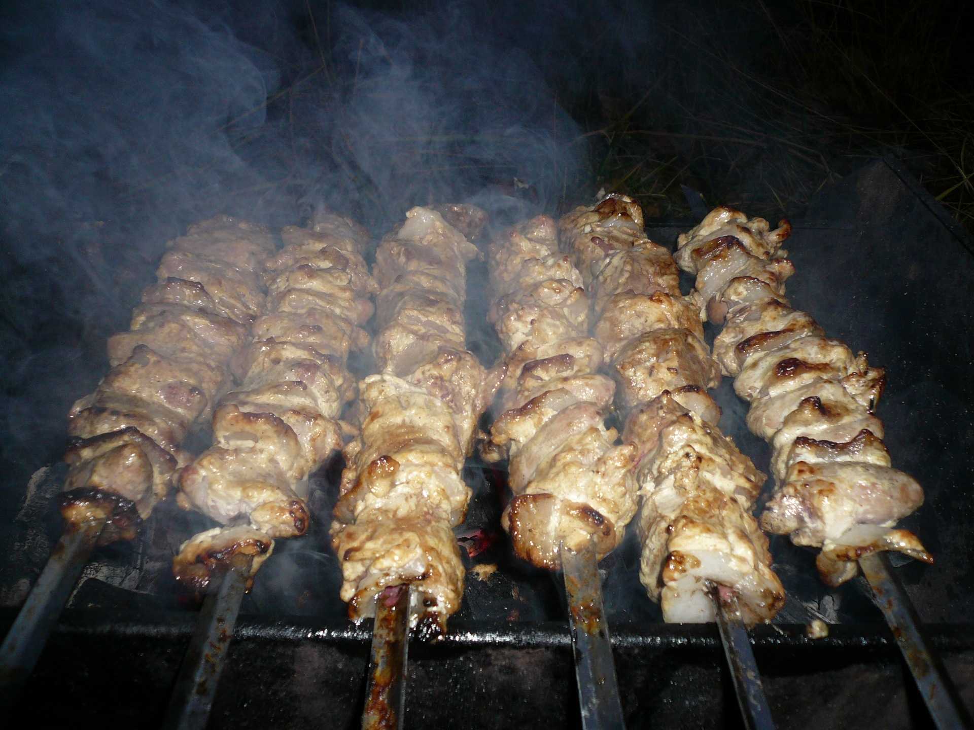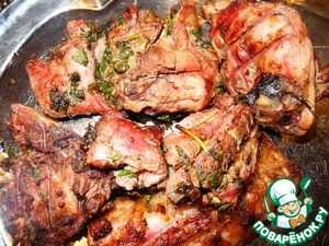 Потом готовьте так же, как обычный шашлык. Если тушка большая, можно порциями. На фото мяса на решетке немного, я взяла только на нас с мужем, а для гостей в выходные было сделано остальное. Жарьте мясо не менее 40-50 минут на хорошем жаре.