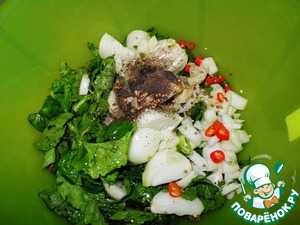 Потом порежьте тушку уже на порционные куски и вымочите еще 3-4 часа. Промойте мясо окончательно и подготовьте специи. Я использую традиционные специи для дичи. Крупно режу много репчатого лука, зелень петрушки и укропа, зелень базилика, все можно использовать и в сухом виде. Добавьте молотый черный перец, перец чили, если любите, можно добавить итальянские травы (орегано, майоран, тимьян), соль, кориандр, оливковое масло. Используйте любые специи для мяса или для шашлыка, хуже не будет, особенно если бобер не молодой