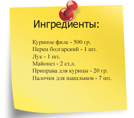 В этом рецепте многие хозяйки боятся, что шпажки начнут гореть. Но избежать этого просто, если замочить заранее палочки в теплой воде. Такой рецепт легко превратить в красочное блюдо для детских дней рождения, если курицу чередовать с кусочками ананаса или помидорками черри.