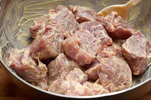 Очистим мясо от жил и пленок, нарежем аккуратными кубиками по 3 — 4 см. Свиное свежее сало порежем не очень тонкими пластинками, а на равные с кубиками мяса, примерно. Затем складываем все в глубокую керамическую или стеклянную миску.