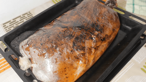 Выпекаем 1 час при t- ре 180-200. После этого рукав, с полуготовым мясом, выглядит как надутый пузырь…