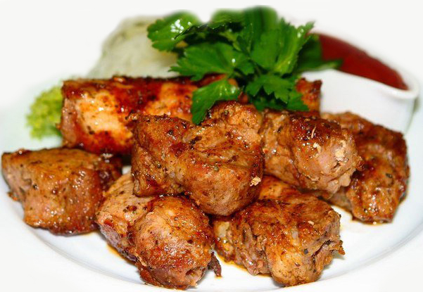 Маринад можно выбрать любой. Но, как показывает практика, лучшим будет обычный – укус и лук. Пока прожаривается шашлык, всем гостям кажется, будто они сидят на природе, наслаждаясь запахом дыма и мяса. А в это время можно на сковородке прожарить репчатый маринованный лук, и приготовить гарнир: картофель по-деревенски, тушеные овощи, свежий салат из овощей.
