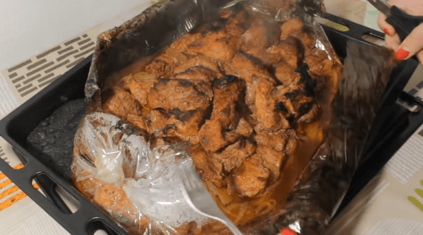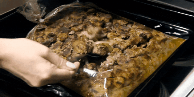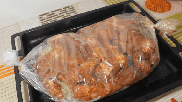 Противень с поставьте в разогретую до 220 °C духовку на час. А чтобы шашлык получился поджаренным, разрежьте рукав и оставьте в духовке ещё на 20–30 минут.