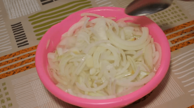 А пока мы займемся лучком — очистим, нарежем полукольцами и тоже замаринуем. Тогда из лука уйдет горечь и у него появится очень пикантный вкус. В миску с луком добавляем 1 столовую ложку соли, 2 ст. ложки сахара, а так же 2- 3 ложки уксуса, а потом зальем все кипятком так, чтобы практически весь лук оказался в маринаде. Оставляем мариноваться 20 минут и сливаем, процеживаем через друшлаг.