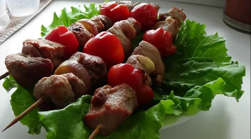 Можно брать свежее сало, или готовое, соленое. А можно вместо него продеть на шпажку между мясом любые овощи — помидорки, кусочки паприки или болгарского перчика, можно вставить оливки. Вообщем, все, что дает сок и будет красиво смотреться в готовом блюде.