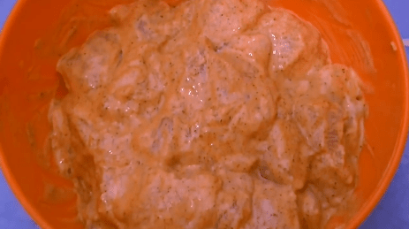 2. Смешаем куриное филе с приправой и майонезом. Ставим для маринования в холодильник на ночь или на 2-3 часа, если нужно быстро.