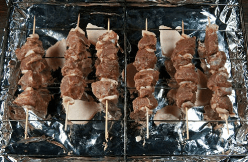 Теперь, когда духовка разогрета, нужно поставить решетку с шашлыками в верхнюю часть духовки, вниз установить противень, чтобы в него стекал сок.