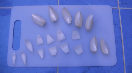 4. Лук очистим и постараемся нарезать примерно таким же размером.