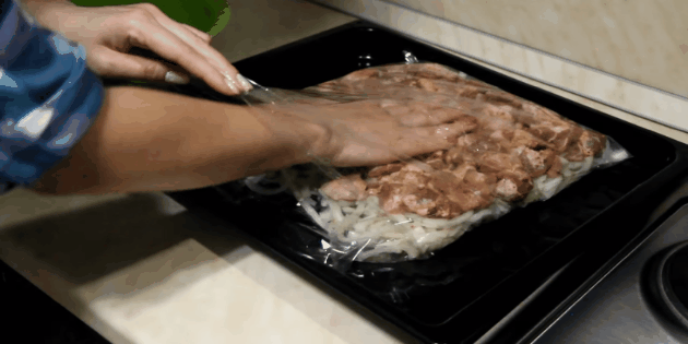 Затем выложите лук в рукав для запекания и распределите почти по всей длине. Сверху положите замаринованное мясо, не перемешивая его с луком. Завяжите пакет и сделайте в нём несколько проколов.