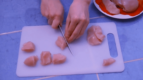 1. Мясо промоем и обсушим бумажным полотенцем. Нарежем кубиками.