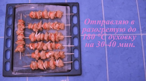 6. Укладываем шпажки с курицей на противень, застеленный бумагой для выпечки, и отправляем их в разогретую духовку на 30 — 40 мин при t-ре 180°С.