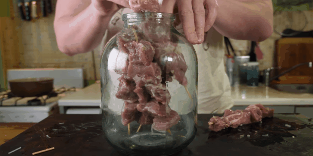 Кусочки мяса точно так же, как и в первом способе, насадите на шпажки. Затем поставьте их в чистые сухие банки объёмом 3–5 литров. Размер банки будет зависеть от длины шпажек и количества на них. В одну банку поместится не больше пяти шпажек.