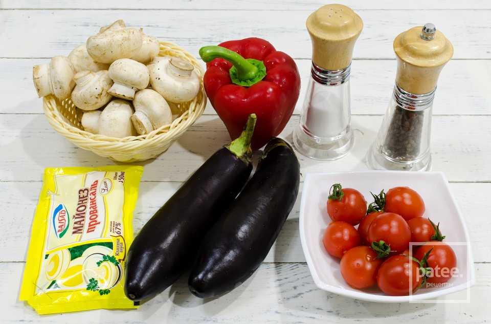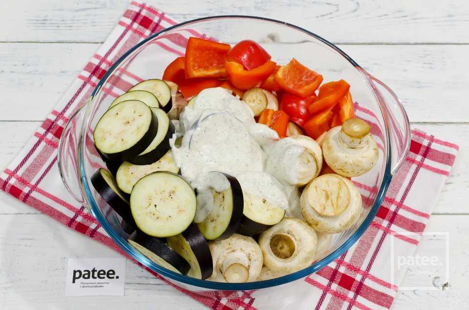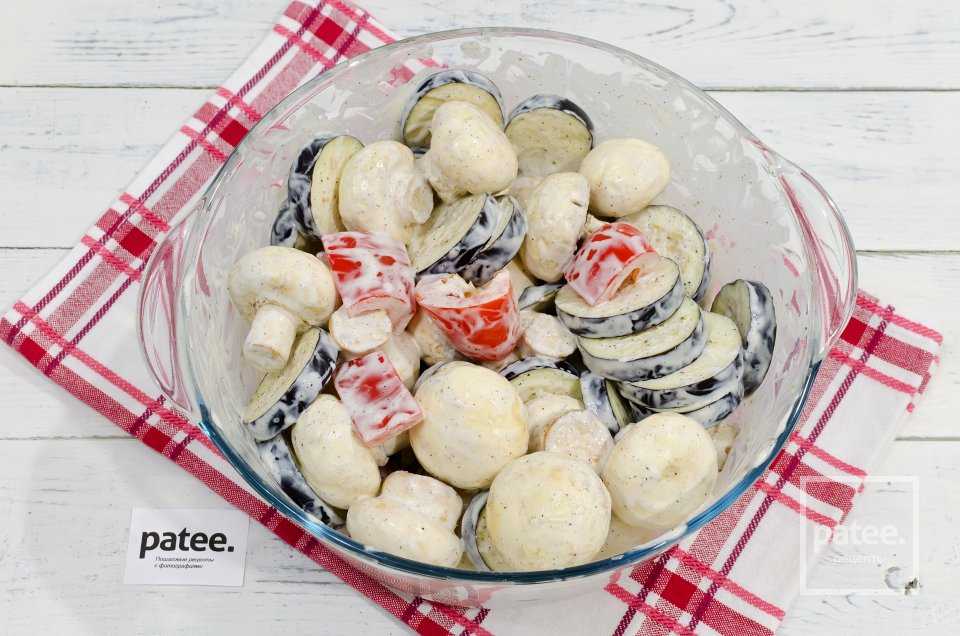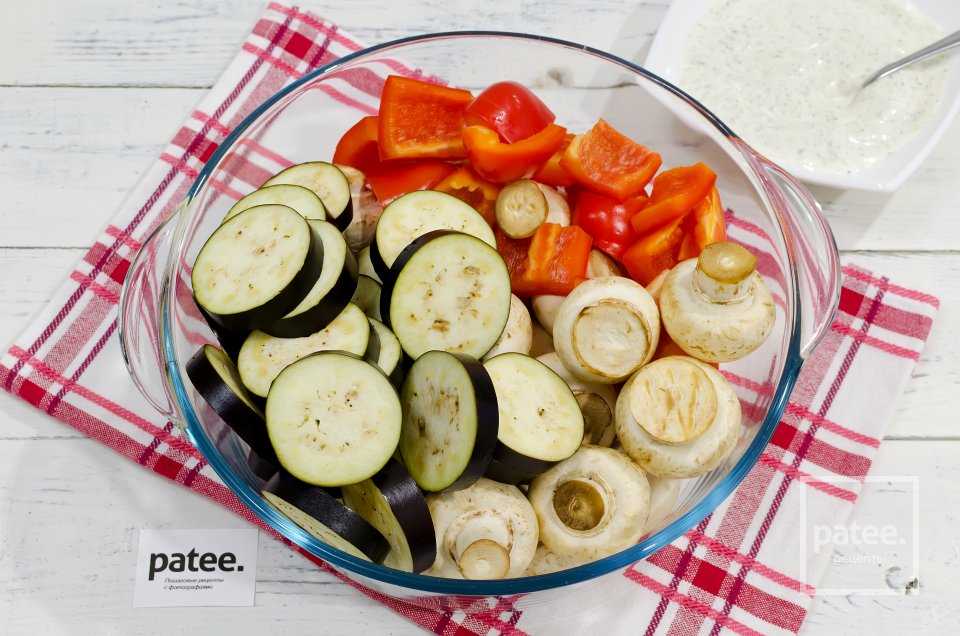 Необходимо 0,6 кг шампиньонов надо вымыть, выложить в глубокую миску, смешать с мелкими томатами (0,3 кг), сладким болгарским перцем (3 шт), кружками кабачков и баклажанов (по 2 шт), кольцами лука-репки (2 шт).