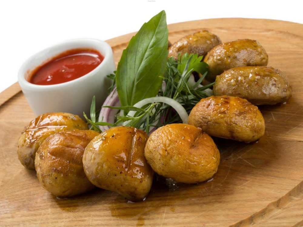 Такие грибы можно нанизать на шпажки или шампуры, и обжарить на углях в течение 10 минут. Стоит учесть, что время приготовления зависит не только от способа, но и от размера грибов — крупным шампиньонам понадобится больше времени, чем мелким. Шашлык, приготовленный таким способом, имеет очень ярко выраженный вкус, и вполне хорош сам по себе. Поэтому лучше не дополнять его различными соусами, а подавать с поджаренными ломтиками хлеба или овощами.