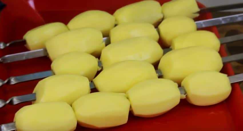 - Сделайте на клубнях неглубокие поперечные надрезы с двух сторон от шампура.