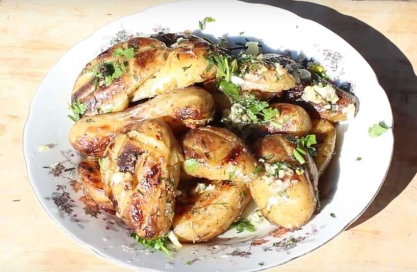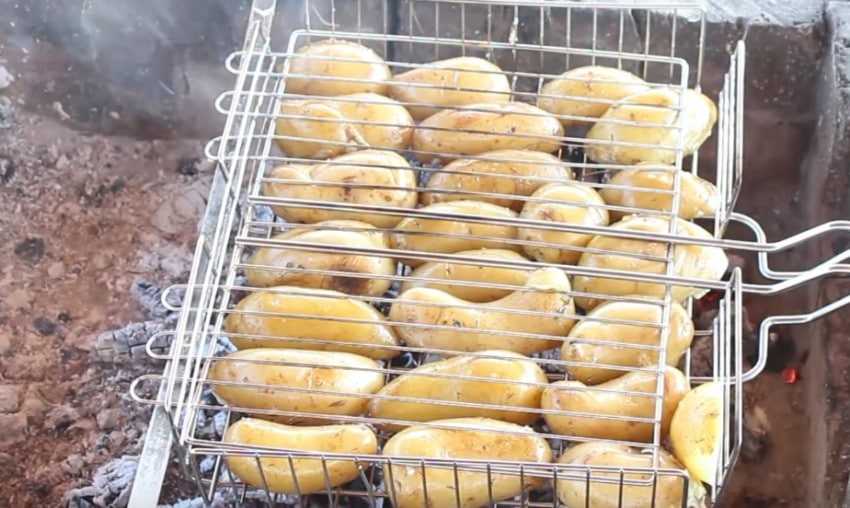 Чтобы овощ лучше пропёкся, его нужно обернуть фольгой и в ней пожарить, а потом фольгу снять и румянить овощи на углях. Как вариант, можно сперва отварить клубни, а потом запечь на шпажках или решётке.