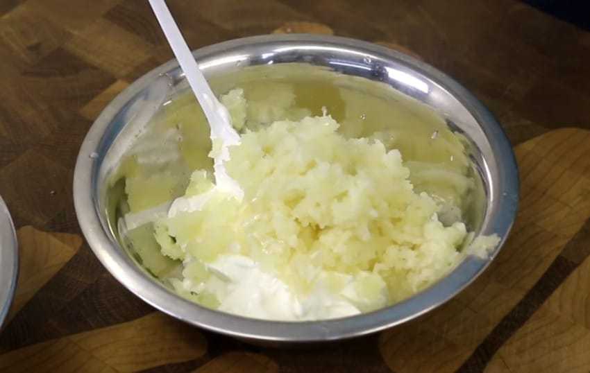 1. Выложите сметану в отдельную миску и подавите туда головку чеснока. Можно меньше, если не любите остроты.