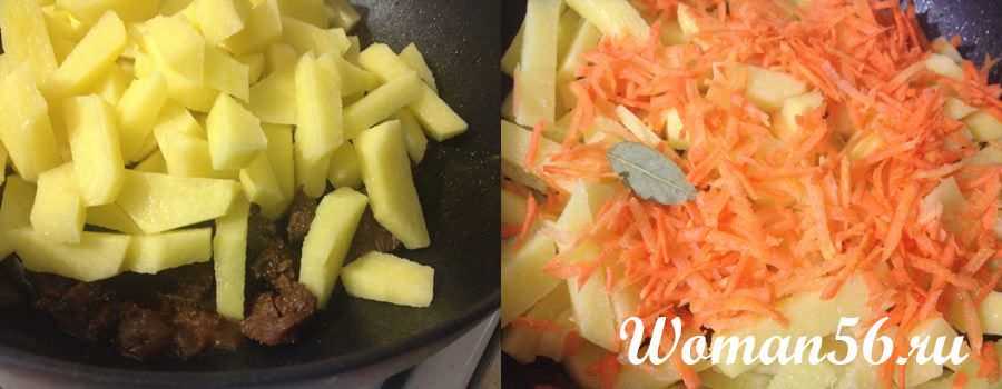 Затем добавьте нарезанный картофель, соль, морковь, лавровый лист, специи, немного воды (примерно пол стакана — стакан — в зависимости от объема блюда), накройте крышку и оставьте еще на 30-40 минут.