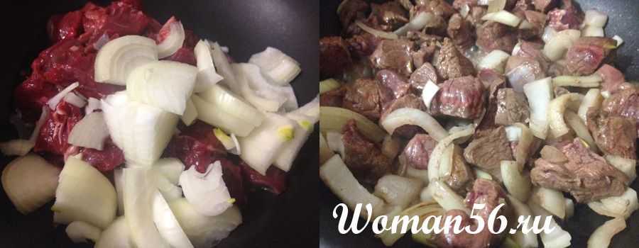Промойте хорошо мясо, нарежьте порционными кусками и оставьте замачиваться (как описано в рецепте выше). Затем нарежьте лук. Разогрейте сковороду с растительным маслом и выложите в нее мясо и лук, обжаривайте в течении нескольких минут постоянно помешивая, пока не появится сок.
