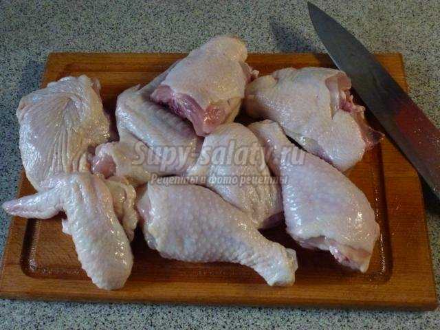 Курицу промоем и нарежем на кусочки. Можно использовать отдельные части курицы – бедрышки или голени. Обсушиваем курицу и складываем кусочки в стеклянную или эмалированную посуду.