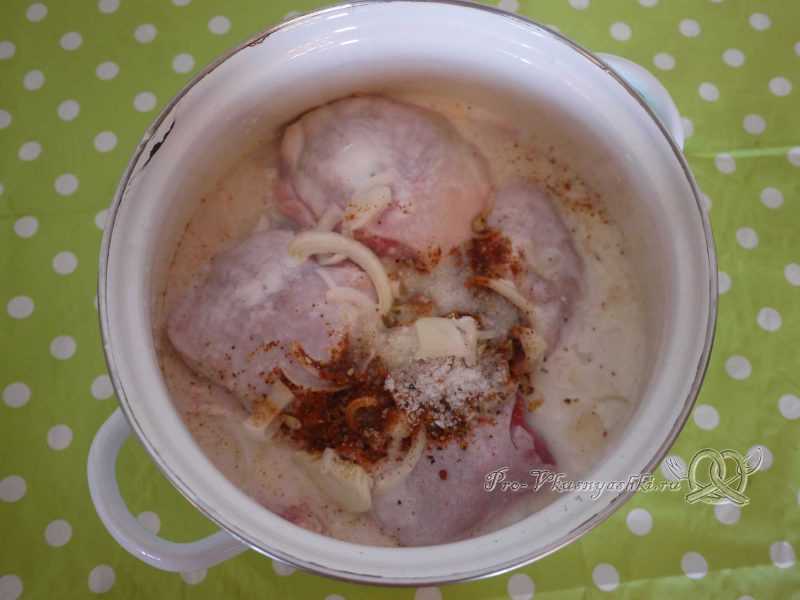 Помещаем куриные бедрышки в кастрюлю достаточного объема. Туда же выливаем газированную минеральную воду (1 ст) и кефир (1 ст).