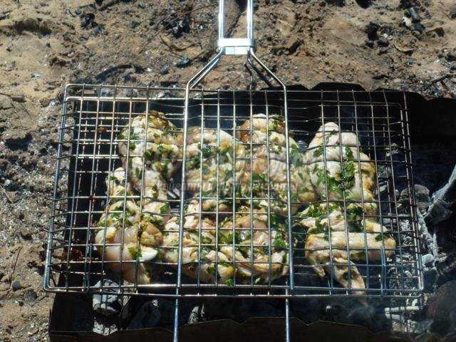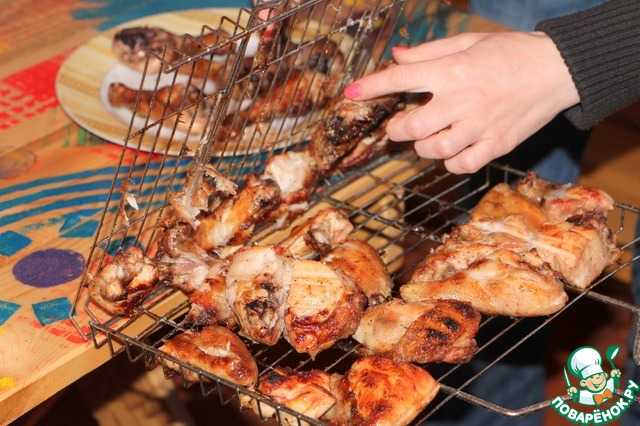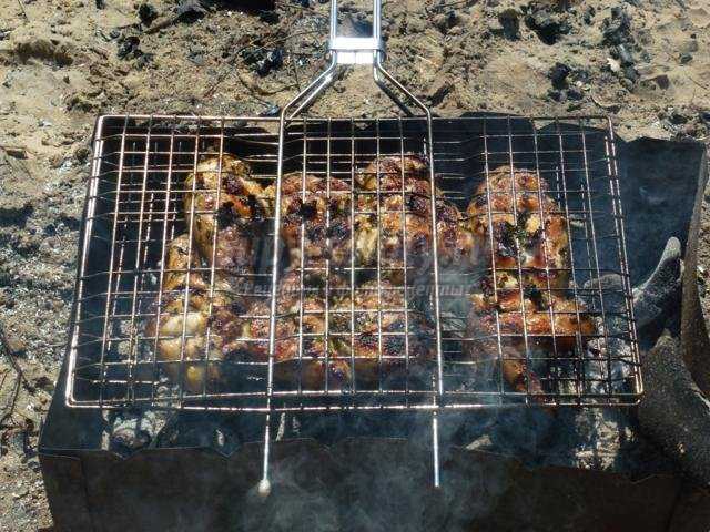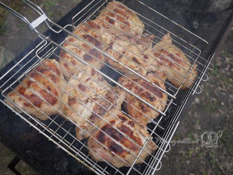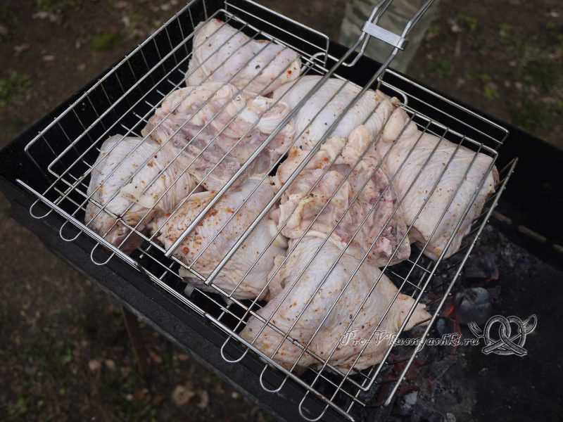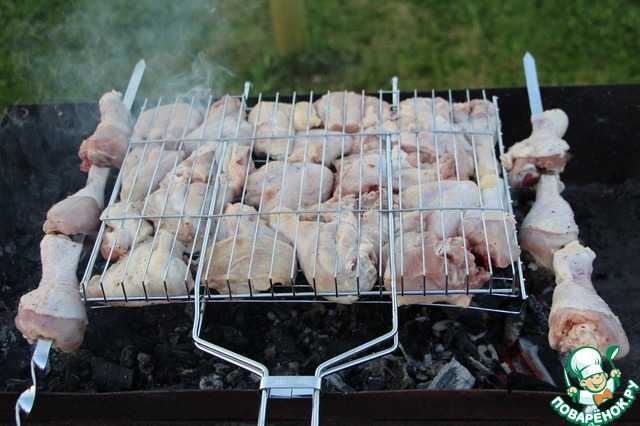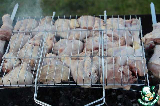 Разжечь угли, дать им прогореть, когда угли подернутся «седым пеплом», выложить кусочки курицы на решетку, посолить и поместить решетку на мангал. Усики-фиксаторы на решетке обеспечивают устойчивое положение на мангале.