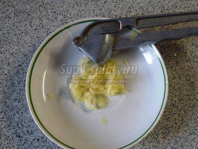 Смешиваем соевый соус с горчицей, нужно смешать эти два продукта до полной однородности. Затем добавляем хмели-сунели и сахарную пудру. Очищаем чеснок и измельчаем его при помощи пресса, добавляем чесночную массу в приготовленный соус.