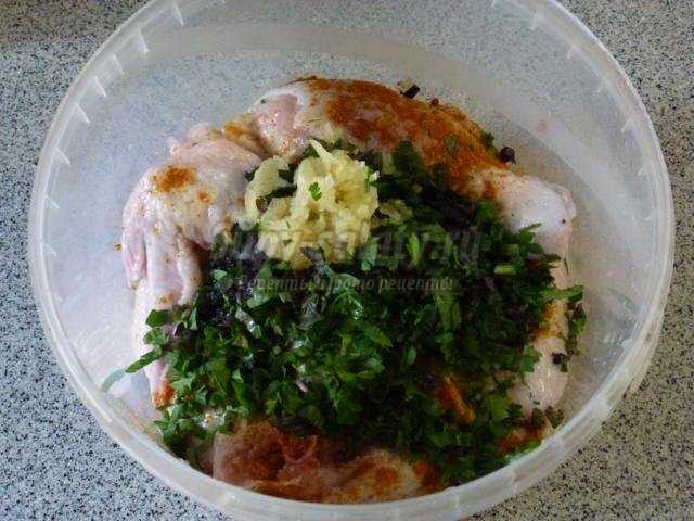 1. Отличный вариант – добавление в маринад грузинской аджики (продают в магазинах) и сушеного базилика. Тогда рецепт приготовления изменится. Вместо корицы используйте базилик, ну а в майонез добавьте чайную ложку такой аджики, а затем добавляйте в подготовленную курицу (смотри рецепт приготовления выше).