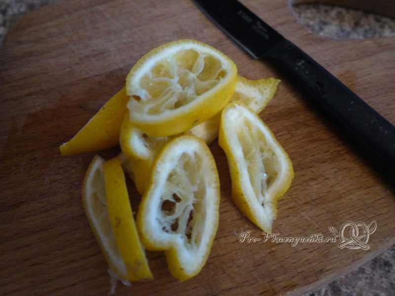 Из одного лимона выжать сок. Выжатый лимон, целый лимон нарезать дольками и добавить к курице и сок, и дольки лимона. Добавить перец, перемешать.