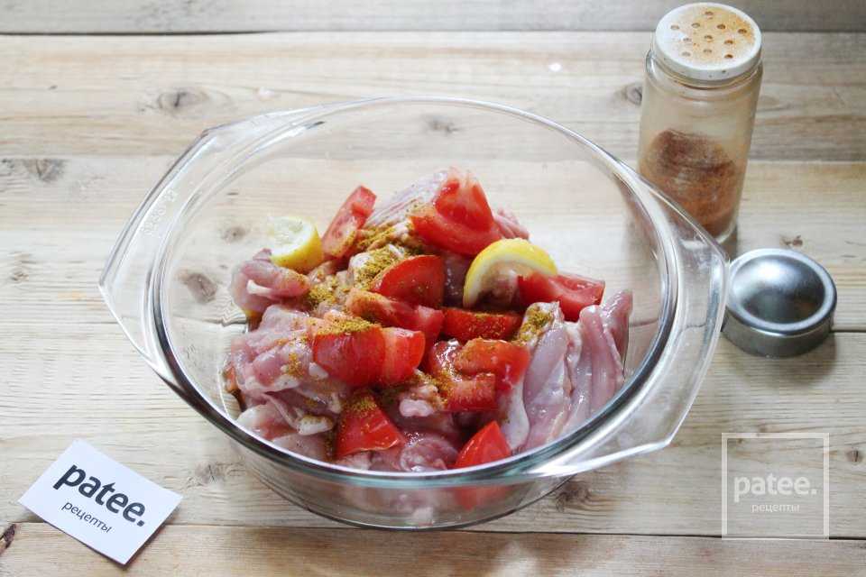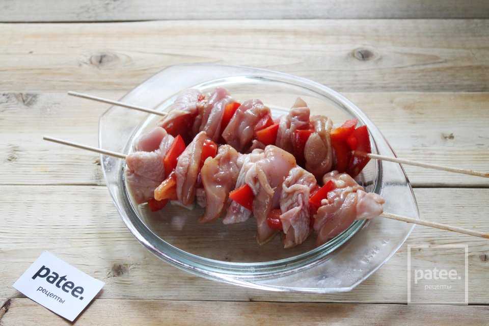 Соберите шашлычки, чередуя куриное мясо, ломтики перца и помидора.