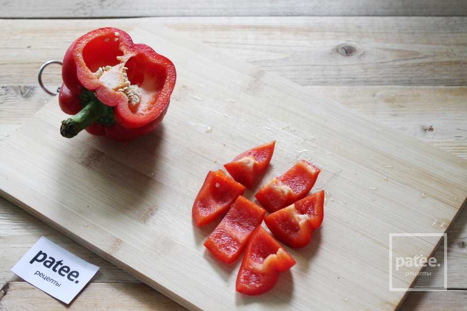 Когда мясо замаринуется, выньте его из холодильника и начните формировать шашлычки. Отрежьте часть от красного перца, порежьте его квадратиками.